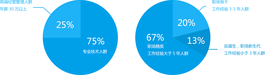 英才網(wǎng)聯(lián)的專業(yè)人才庫中專業(yè)技術(shù)人群占比頗高,可見專業(yè)技術(shù)人群非常雄厚、充足。同時,對于企業(yè)客戶來講,應屆生、職場新生代、職場骨干、職場精英等人群可謂應有盡有,足夠滿足企業(yè)的日常招聘、專業(yè)崗位的招聘等需求。